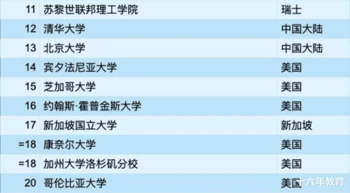 清华大学:连续第三年位居全球第12名,蝉联亚洲高校榜首,稳居中国高校第一。